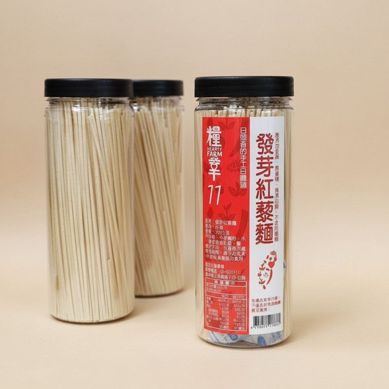 脫殼紅藜炒熟磨成粉+麵粉,無添加黏稠劑,麵條Q彈有口感。用太陽曬出紅藜的天然香氣,堅持日曬手作麵,讓每一口都是享受。獨特的瓶裝手工麵,減少因為無添加黏稠劑導致的易脆易斷,也讓保存更方便。